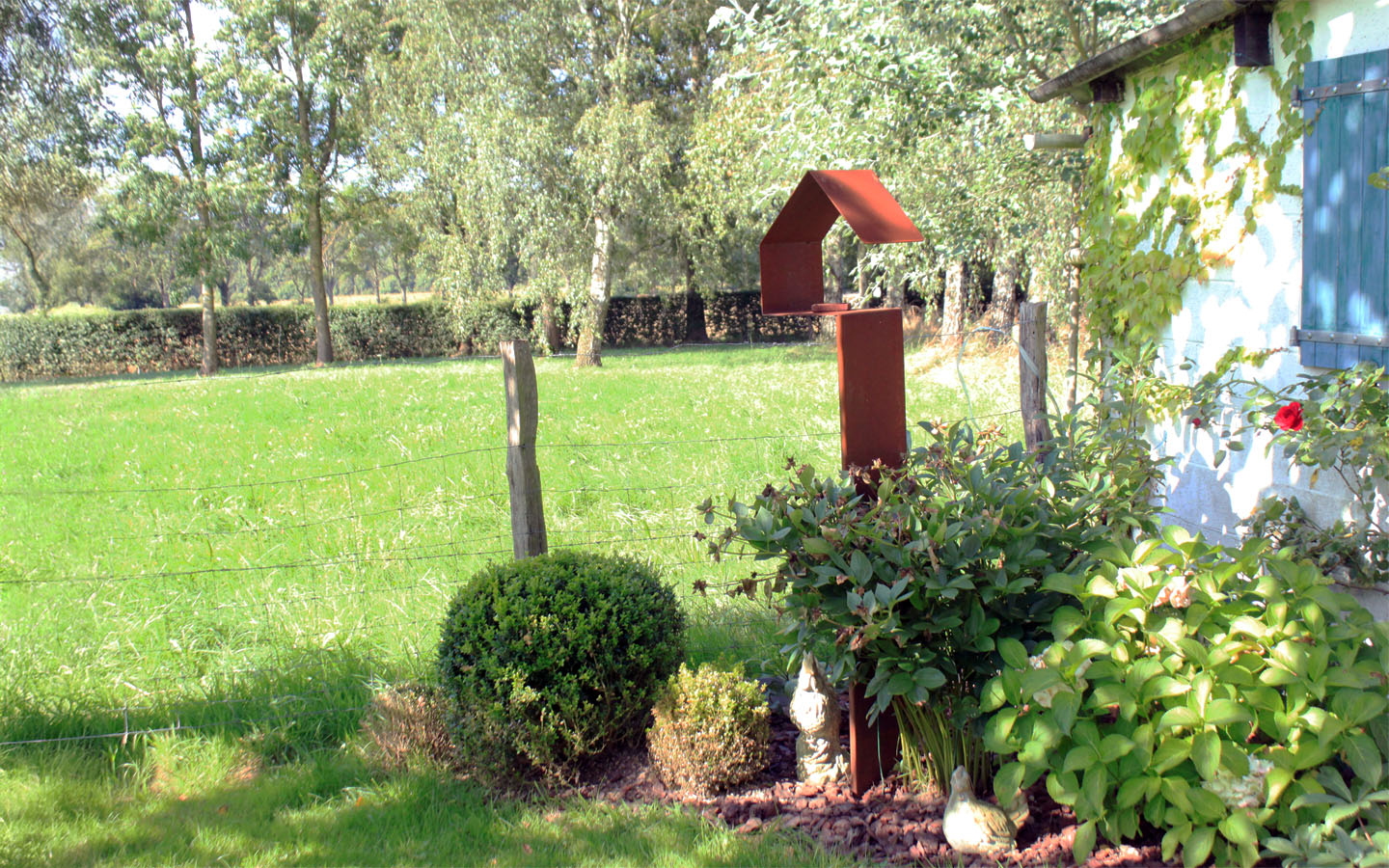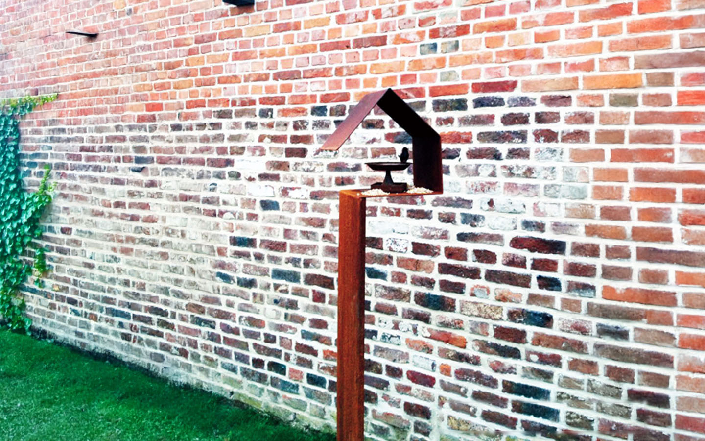 Son piétement se plante facilement dans la terre, pour se fondre dans le paysage au fil des saisons. Chaque mangeoire arrive avec sa patine propre, vivante et unique : une matière qui évolue avec le temps, comme le jardin lui-même.